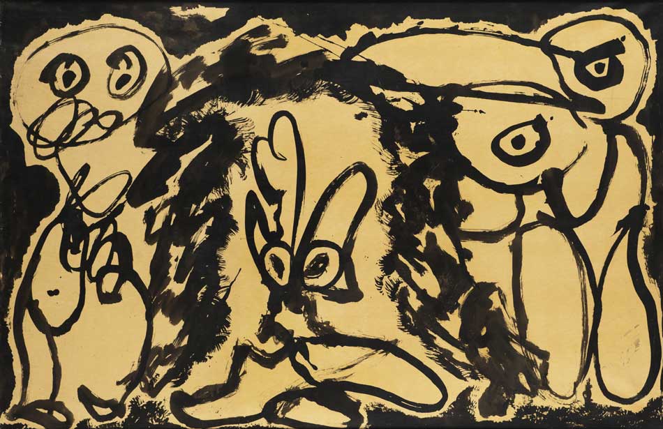 La Collection de la Praye accueille à nouveau Jean Raine pour « payer son tribu à celui qui est assurément l’artiste le plus complexe et le plus important qui ait vécu et travaillé à Lyon dans le dernier demi-siècle, et qui a sans doute plus apporté qu’il n’en a reçu »*. À vrai dire, c’est un musée qu’il faudrait pour rendre compte de la frénétique activité de l’artiste et de la diversité de ses talents : poésie, cinéma expérimental, dessin et finalement peinture. Pour approcher ses histoires, ses migrations, ses cheminements, ses résonnances (la cinémathèque française, la mouvance COBRA, la Californie, les surréalistes), ses cycles, sa vie et sa mort même. Pour suivre sa maturation progressive parallèle à une « dévastation systématique » (J.-J. Lerant). Pour comprendre sa personnalité avide de tout entreprendre, et l’œuvre singulière qu’il nous laisse, toujours au plus intime de ses angoisses existentielles et dans la permanente urgence de leur dépassement. Intimité et urgence : les fondements de l’art vrai, celui qui nous parle et nous trouble.
